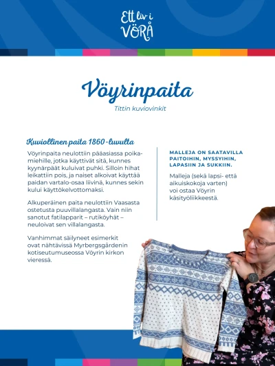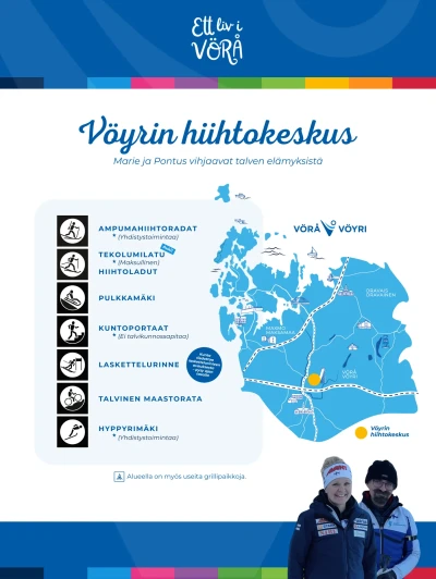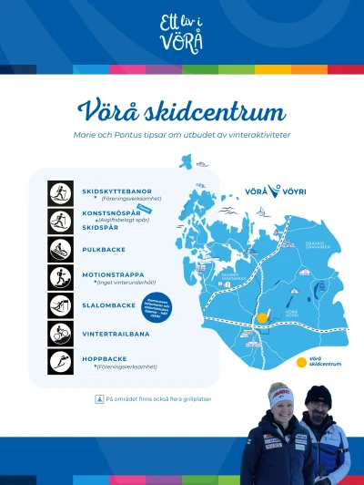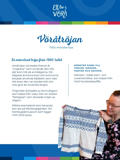 Vörå tips Mervis utflyktskarta - Mervin retkikartta Christers höstkaka - Christerin syyskakku Bo bra i Vörå - Asu hyvin Vöyrillä Fridas grillmatstips - Fridan vinkit grilliruokiin Lyckan på landet - Onni maaseudulla Vöråtröjan - Vöyrinpaita Video: Här berättar Birgitta från Vörå handarbetsaffär om Vöråtröjan! Vinteraktiviteter vid Vörå skidcentrum - Talviaktiviteetit Vöyrin hiihtokeskuksessa Aktiviteter Vörå tips