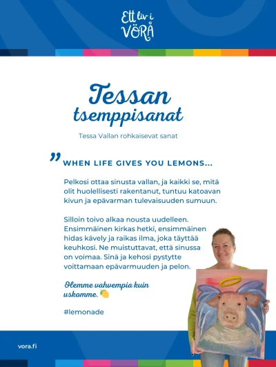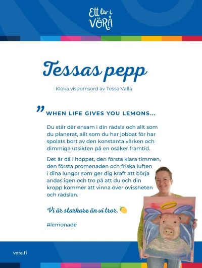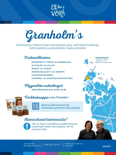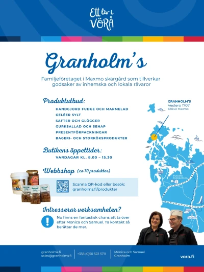 Vörå tips Mervis utflyktskarta - Mervin retkikartta Christers höstkaka - Christerin syyskakku Bo bra i Vörå - Asu hyvin Vöyrillä Fridas grillmatstips - Fridan vinkit grilliruokiin Lyckan på landet - Onni maaseudulla Vöråtröjan - Vöyrinpaita Video: Här berättar Birgitta från Vörå handarbetsaffär om Vöråtröjan! Vinteraktiviteter vid Vörå skidcentrum - Talviaktiviteetit Vöyrin hiihtokeskuksessa Wilsons inredningstips - Wilsonin sisustusvinkit Jessicas och Christers hästtjänster och ridlektioner - Jessican ja Christerin hevospalvelut ja ratsastustunnit Carinas lussebullartips - Carinan lucia-pullavinkit Annas fördelar med livet på landet - Annan edut maaseutuelämässä Revytips i Vörå - Revyyvinkkejä Vöyrissä Gårds Smak, så här gör du - Gårds Smak, näin teet Pias tips, Hunurinjärvi - Pian vinkki, Hunurinjärvi Granholm's produkter - Granholmin tuotteet Tessas pepp - Tessan tsemppisanat Aktiviteter Vörå tips